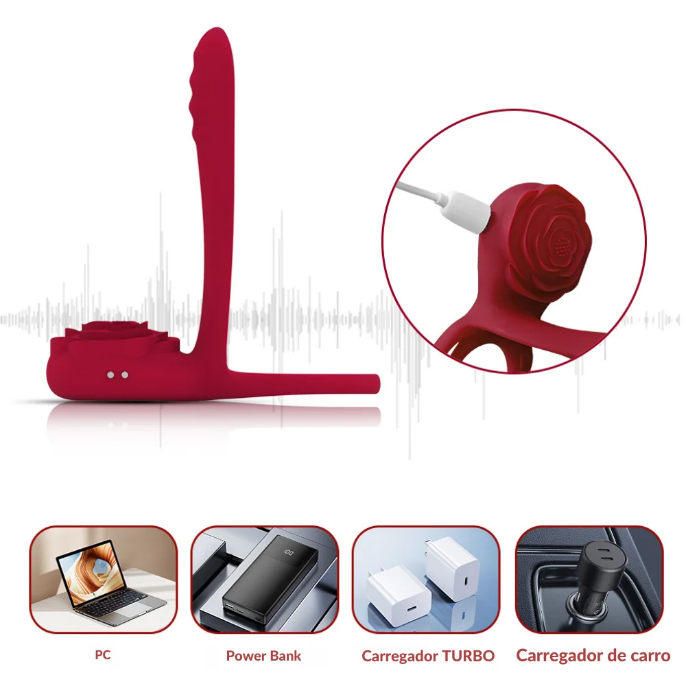 Carregue o anel e o controle antes do uso. Aplique lubrificante à base de água na base do pênis e coloque o anel, posicionando a flor voltada para frente. Acione o botão de ligar ou use o controle remoto para escolher entre os modos de vibração. A cada movimento, a base vibratória estimula o clitóris ou outras zonas erógenas da parceira, enquanto o anel ajuda a manter a firmeza e prolongar o prazer.