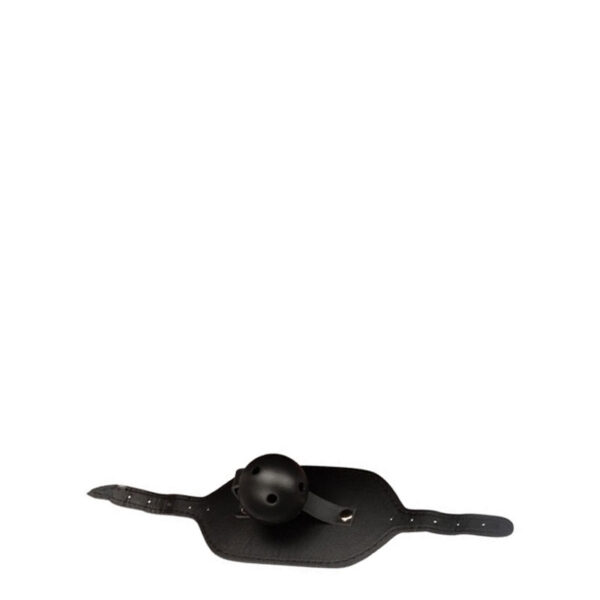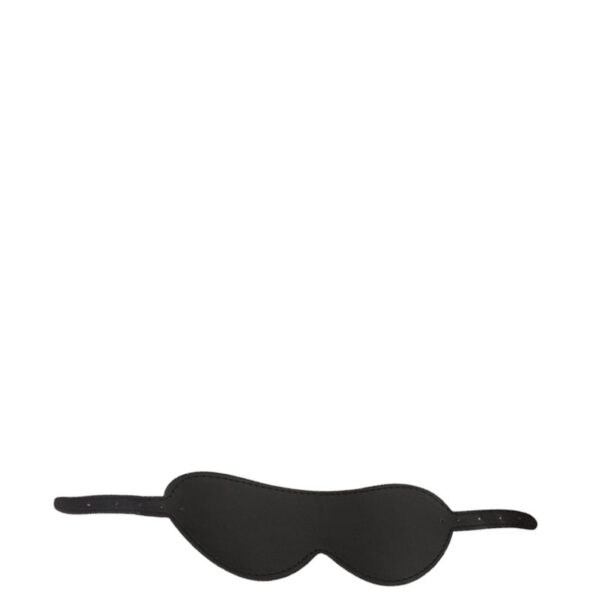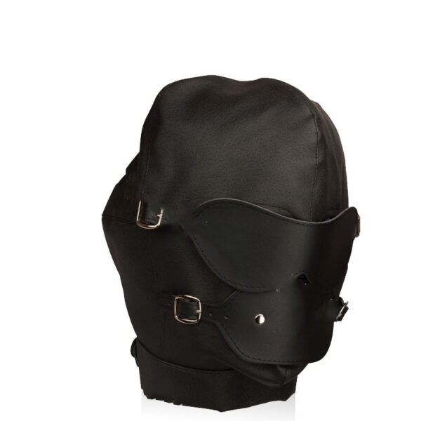 Capuz com venda e mordaça removíveis. Possui cordões atrás para ajuste.