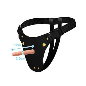 Fixe o pênis o introduzindo no furo da cinta. Ajuste firmemente a cinta ao seu corpo.