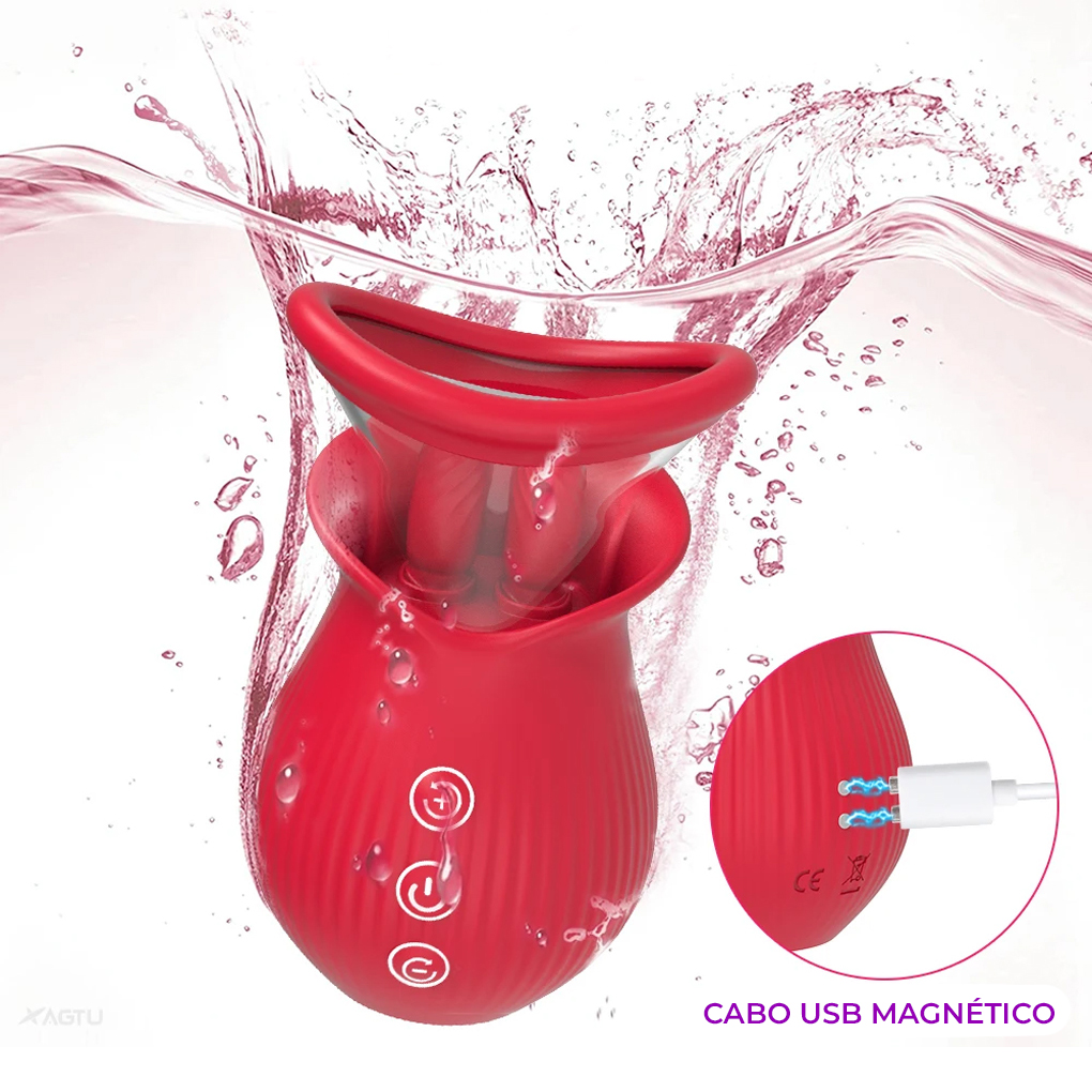 Pressione o botão “Power” para ligar, clique no mesmo botão para mudar a potência das estimulações da língua. Clique nos botões de “+” e “-” para aumentar ou diminuir as sucções. Para desligar, basta manter pressionado o botão “Power” até que o produto pare por completo. Use lubrificante.