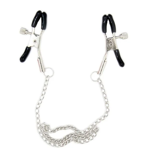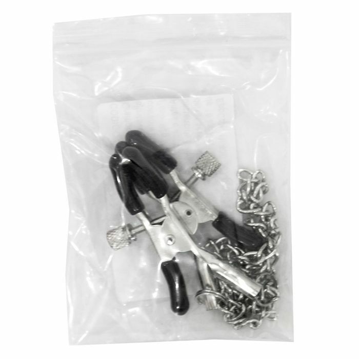 Grampos para os seios em metal com presilhas ajustáveis para diversificar a pressão, possui corrente que interliga os dois grampos!