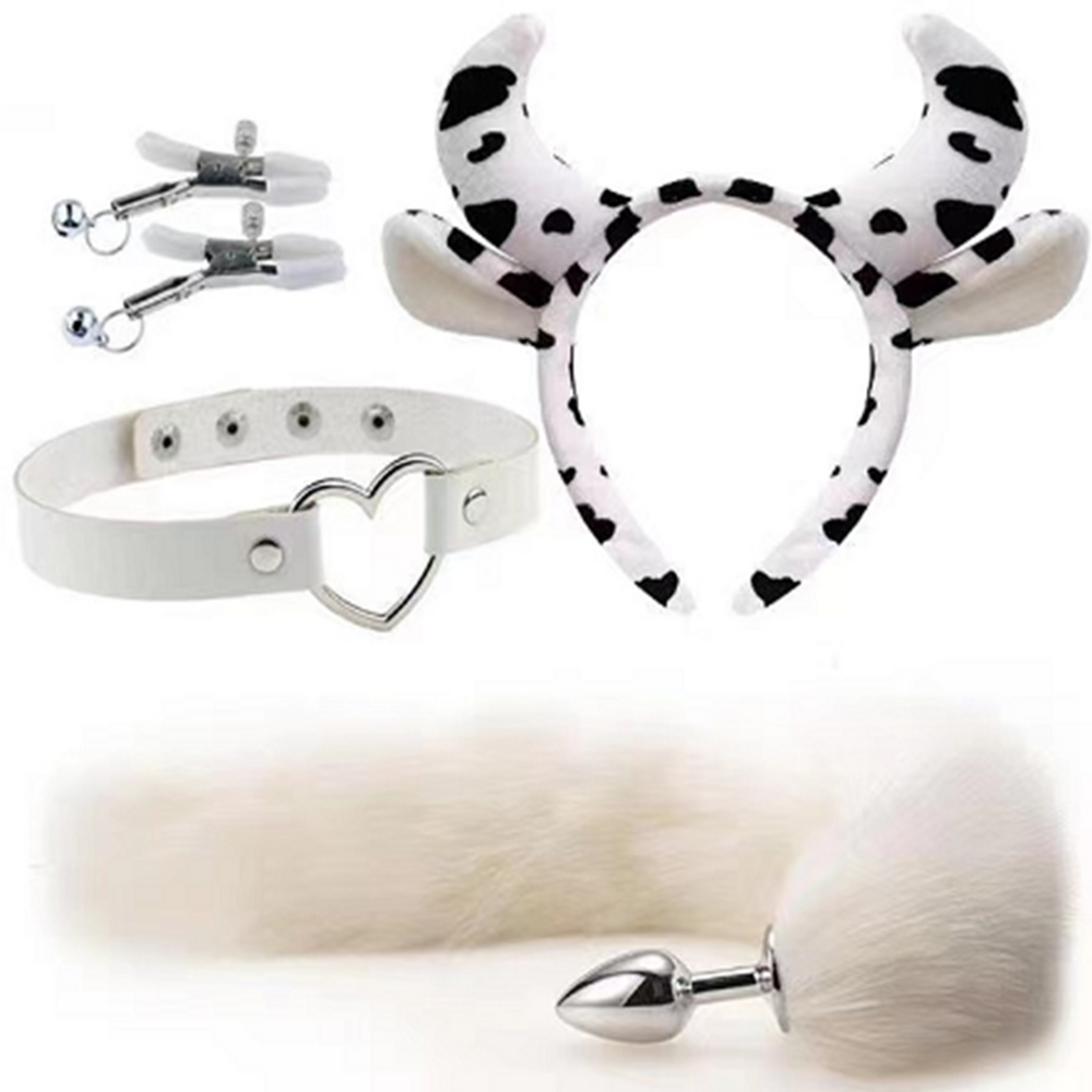 Kit composto por 1 tiara de pelúcia em design de vaquinha + 1 plug anal com cauda de pelúcia + 1 par de grampos para seios em metal com presilhas ajustáveis com guizo na ponta + coleira com coração vazado.