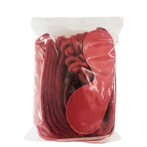 Kit bondage com 7 peças com forro em pelúcia. Possui: 1 venda, 1 mordaça, 1 par de algemas, 1 par de tornozeleiras, 1 chicote, 1 coleira com guia, e 1 corda com 5 metros.