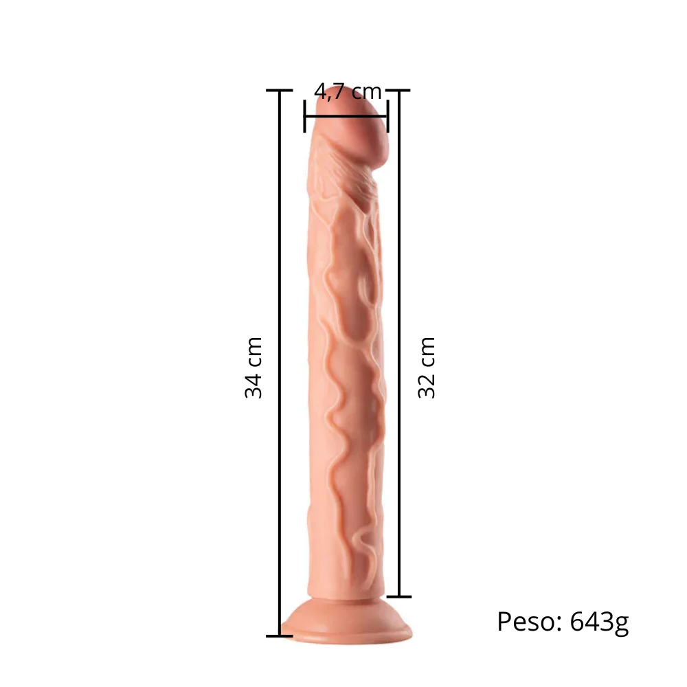 Pênis realístico confeccionado em silicone macio e flexível, com textura detalhada que imita veias e glande real. Possui ventosa resistente na base, permitindo fixação em superfícies lisas e uso com cintas penianas. Seu tamanho avantajado proporciona penetração intensa e realista, ideal para quem busca experiências mais completas.