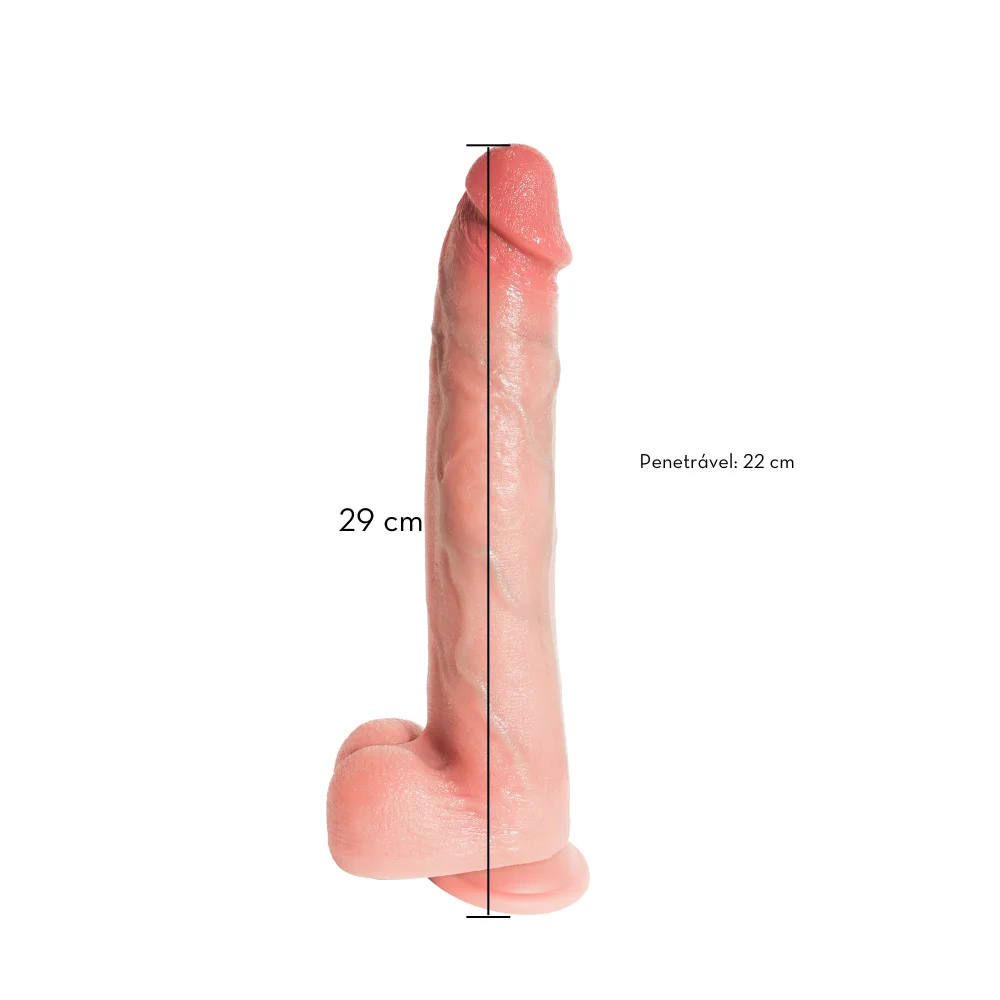 Pênis realístico com vibração, glande, veias reais, escroto e ventosa, acompanha controle remoto. Possui função de aquecimento para imitar a temperatura corporal, proporcionando uma experiência mais realista.
