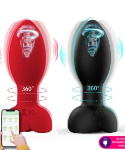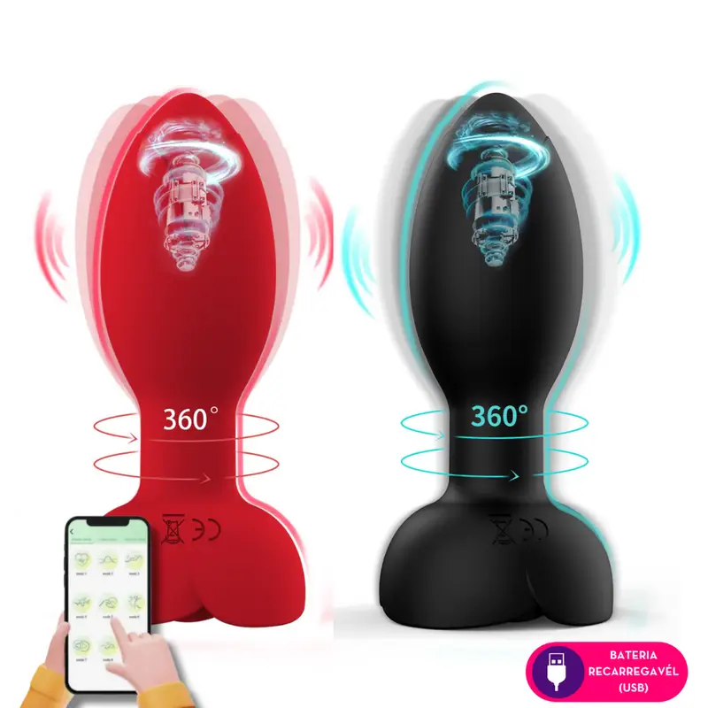 Plug anal vibratório por aplicativo em silicone com rotação 360°. Possui toque suave, aveludado e detalhes metalizados na base.