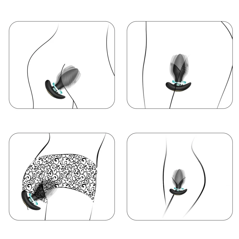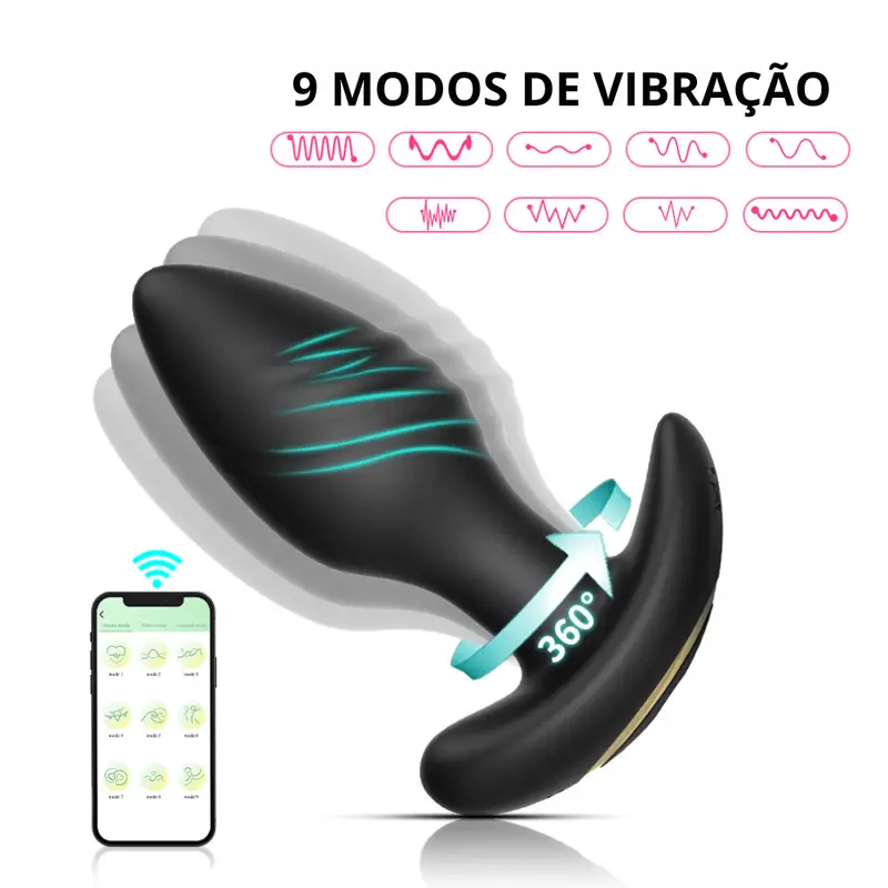 Plug anal vibratório por aplicativo em silicone com rotação 360°. Possui toque suave, aveludado e detalhes metalizados na base.