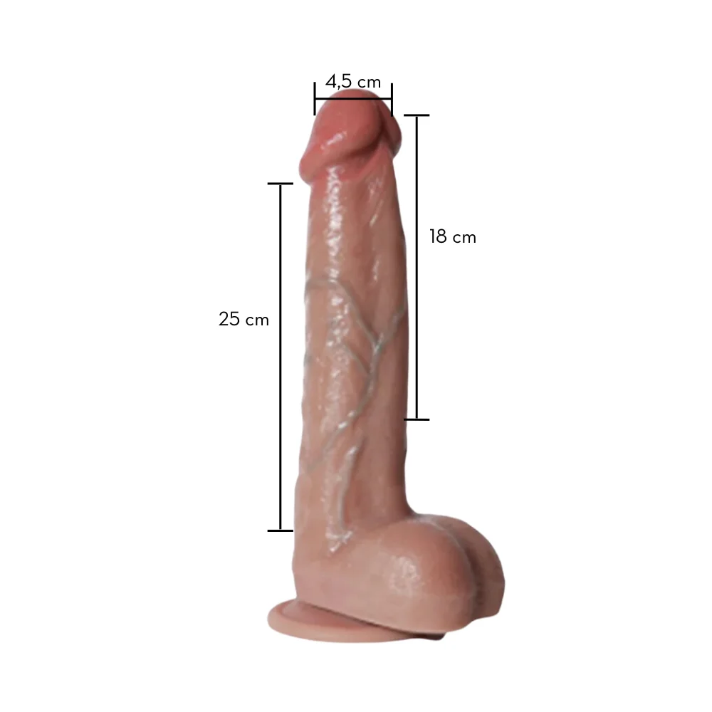 Prótese peniana realística com glande, veias reais, escroto e ventosa, acompanha controle remoto. Possui função de aquecimento para imitar a temperatura corporal, proporcionando uma experiência mais realista.