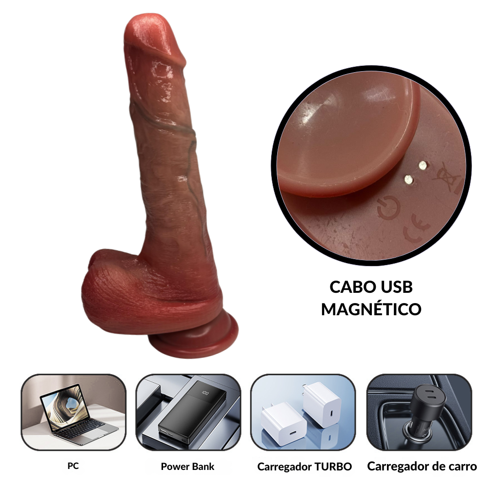 Prótese peniana realística com glande, dupla camada de silicone, veias reais, escroto e ventosa, acompanha controle remoto. Possui função de aquecimento para imitar a temperatura corporal, proporcionando uma experiência mais realista.