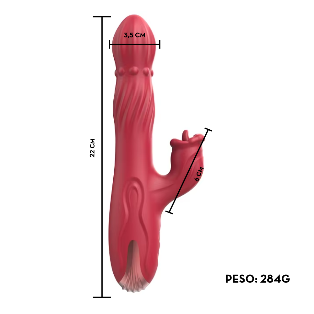 Medidas: Comprimento total: 22 cm – Diâmetro da ponta: 3,5 cm – Comprimento do estimulador clitoriano: 6 cm – Peso: 284 g