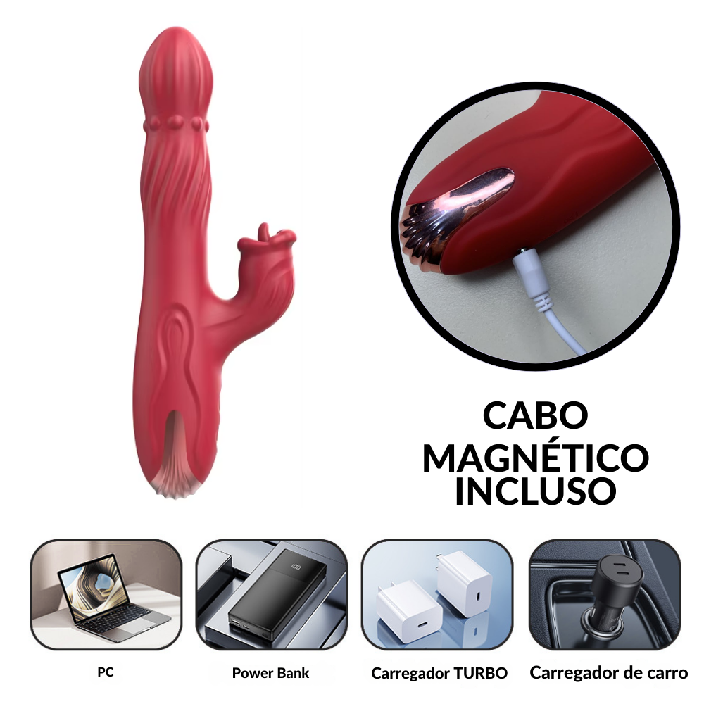 Este vibrador foi desenvolvido para oferecer uma experiência diferenciada de prazer, combinando vibração intensa com uma metade superior giratória, que realiza movimentos rotativos contínuos durante o uso. Esse sistema proporciona estímulos mais profundos e envolventes, intensificando as sensações de forma única. O modelo conta ainda com estimulador clitoriano integrado, permitindo estimulação simultânea interna e externa. Seu corpo possui texturas e relevos estratégicos, que aumentam o contato e o prazer a cada movimento. Fabricado em silicone macio de alta qualidade, garante toque aveludado, conforto e segurança.
