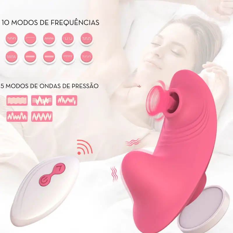 Vibrador calcinha com formato anatômico, imã para prender na calcinha e relevos massageadores com estimulador clitoriano por Tecnologia de Vibroar e controle remoto.