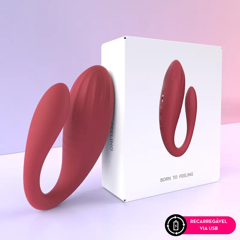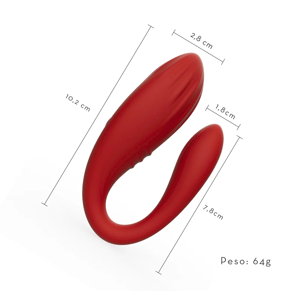 Vibrador duplo em silicone por aplicativo, flexível e anatômico, que estimula clitóris e ponto G ao mesmo tempo.