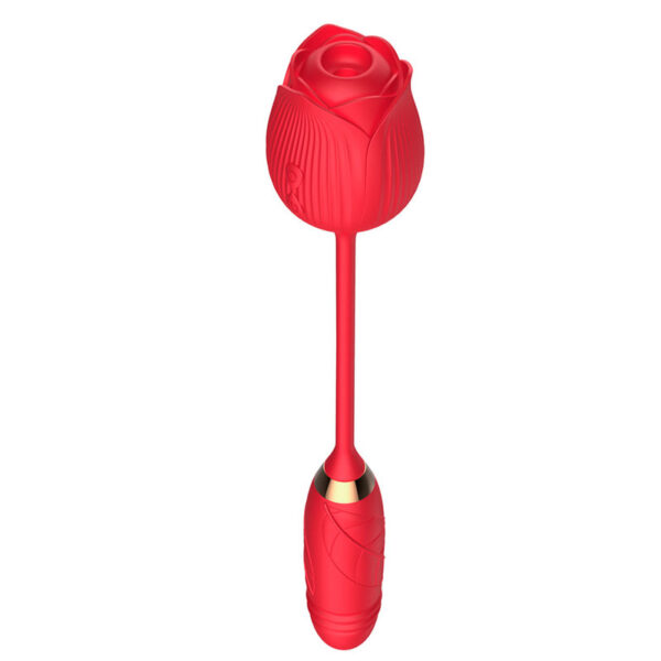 Vibrador duplo formato de rosa e penetrador com movimentos de vai e vem.