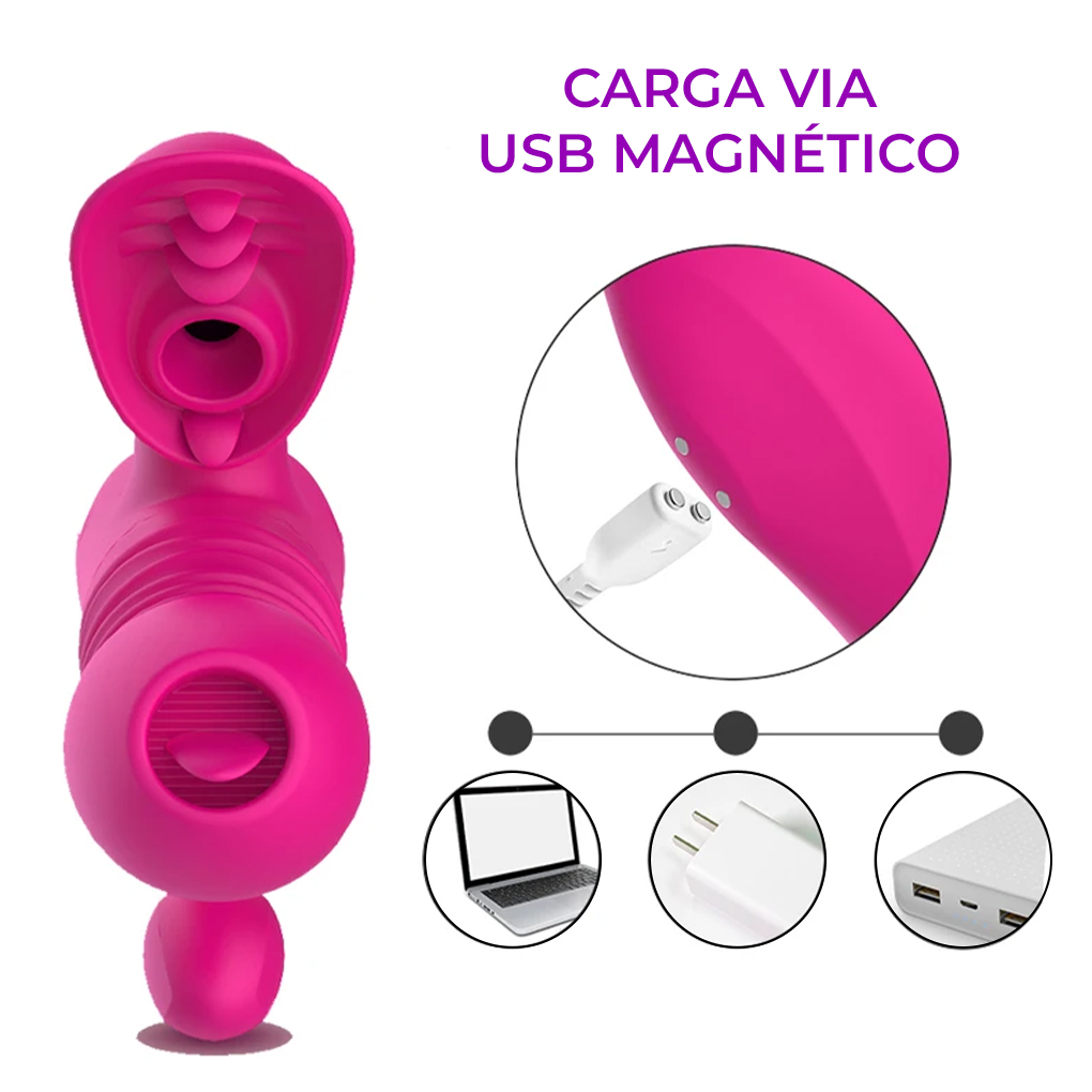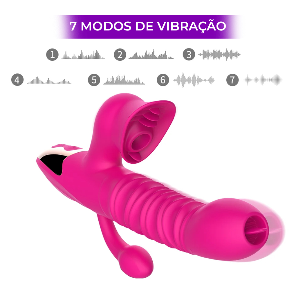 O Vibrador com sugador de clitóris, ânus, aquecimento e vai e vem foi feito para você que gosta de sentir o prazer da penetração enquanto vibra, sobe e desce, esquenta, suga o clitóris com ondas de pressão e estimula o ânus tudo ao mesmo tempo.